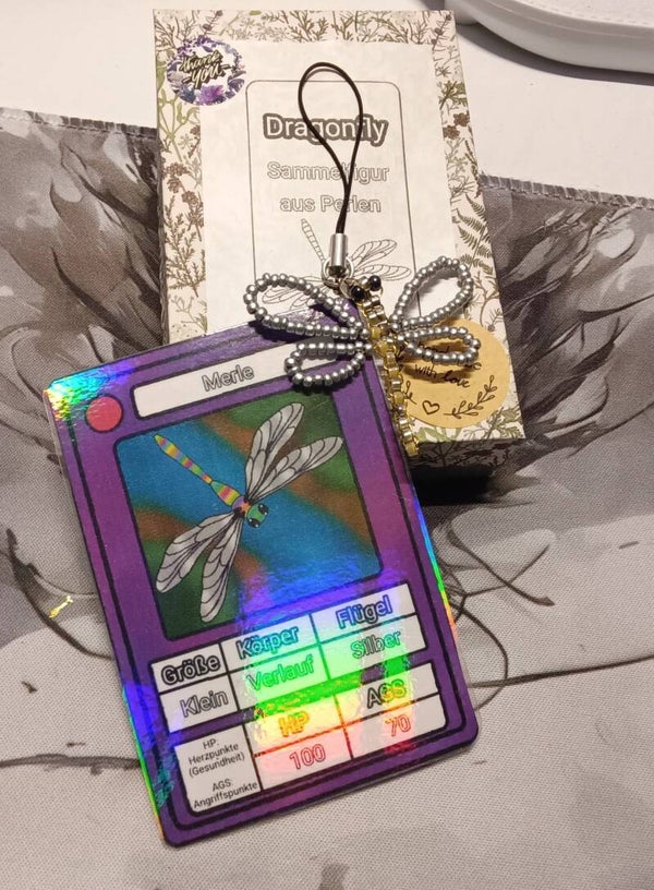 In dieser handgemachten Mystery Box befindet sich eine handgemachte Sammelkarte und eine handgemachte Dragonfly Figur aus Perlen, die man sogar als Schlüsselanhänger nutzen kann.